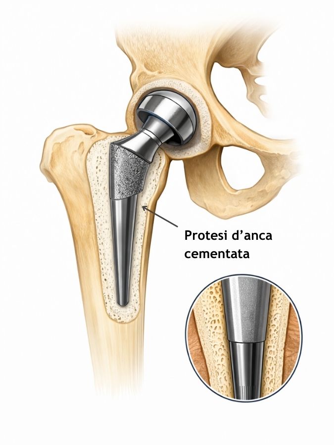 Questa soluzione viene utilizzata soprattutto in presenza di osso fragile, osteoporotico e con una struttura meno adatta a sostenere un impianto press-fit. In tali situazioni il cemento consente una distribuzione omogenea dei carichi, riducendo il rischio di fratture periprotesiche.